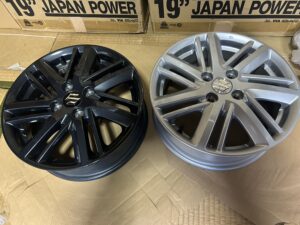 まずはじめはスズキのソリオ純正ホイール・タイヤセットです。お隣県のお客様で直接お持込していただきました。ノーマルカラーのシルバーと希少なグレーの純正ホイールを2セットと社外アルミホイールのご売却です。